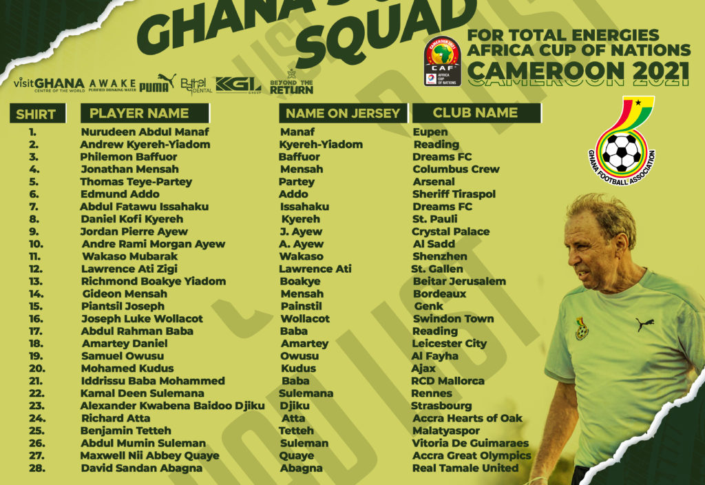 Milovan Rajevac , the head coach of the Black Stars, has named a final 28-man squad for the 2021 African Cup of Nations (AFCON) tournament scheduled to take place in Cameroon.