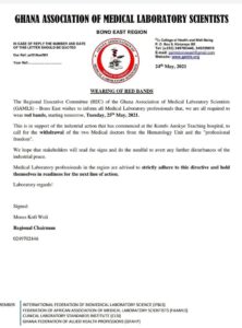 “The Regional Executive Committee (REC) of the Ghana Association of Medical Laboratory Scientists (GAMLS) – Bono East Region, wishes to inform all Medical Laboratory professionals that, we are all required to wear red bands, starting Tuesday, 25th May, 2021.”
