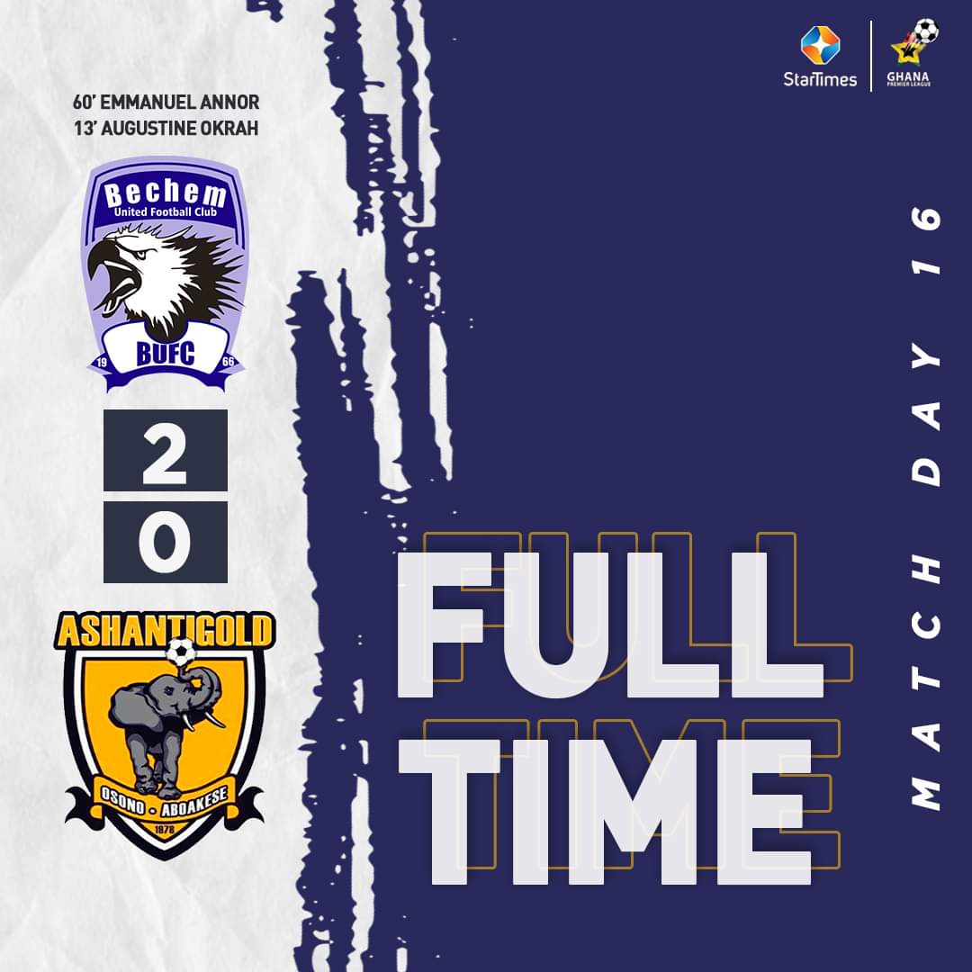 Bechem United have now gone nine games without a defeat after beating AshantiGold 2-0 in a Ghana Premier League match day 16 game.
