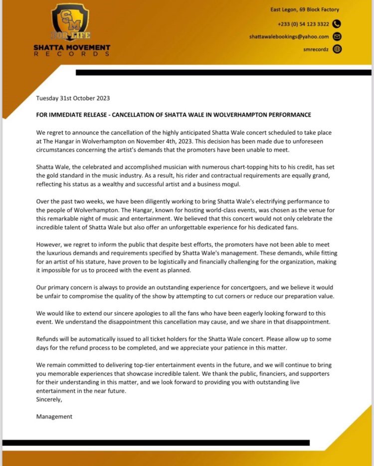 Self-acclaimed dancehall king Shatta Wale has canceled his concert, which was scheduled to take place at The Hangar in Wolverhampton on November 4, 2023.