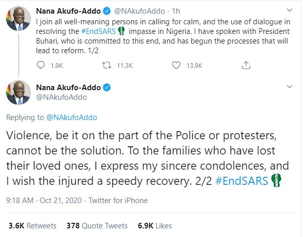 The tweet by President Akufo-Addo read “I join all well-meaning persons in calling for calm, and the use of dialogue in resolving the #EndSARS impasse in Nigeria. I have spoken with President Buhari, who is committed to this end, and has begun the processes that will lead to reform.”